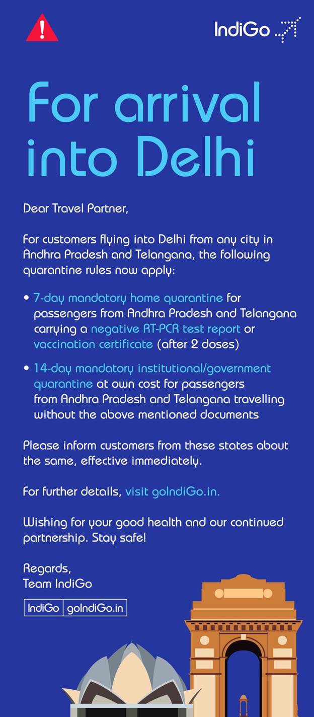 1. It has been made mandatory for passengers arriving from Maharashtra to carry RT-PCR negative certificates not older than 72 hours at the time of arrival into NCT of Delhi.