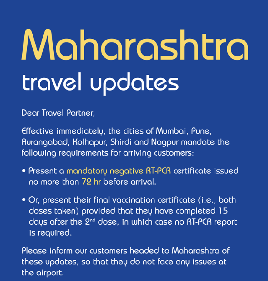 4. It is mandatory for passengers arriving from Maharashtra and Kerala to carry RT-PCR negative test report done within 72 hours prior to departure.
